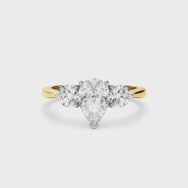 This timeless custom-made pear cut diamond trilogy engagement ring, made with your choice of diamond centre stone, features two 0.25ct round brilliant cut diamond side stones. Exuding fluidity in its line work, and boasting an elegant silhouette, as with all the pieces in our Bespoke Collection, this piece is made especially for you.