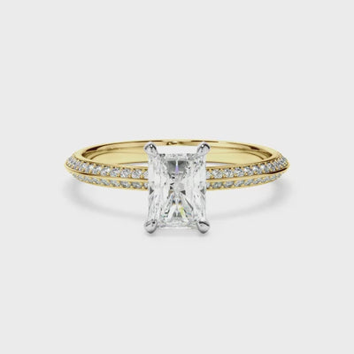 This timeless custom-made radiant cut diamond solitaire ring, made with your choice of diamond centre stone, featuring two rows of round brilliant cut diamonds pave set across a knife edge band. Exuding fluidity in its line work, and boasting an elegant silhouette, as with all the pieces in our Bespoke Collection, this piece is made especially for you.